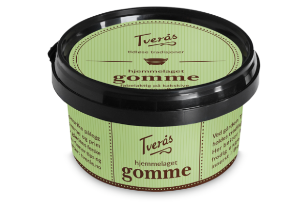 Gomme fra Tverås har en jevn, lysebrun farge og en konsistens som er lett smørbar. Mild smak, og tilsatt krydder som kanel og kardemomme